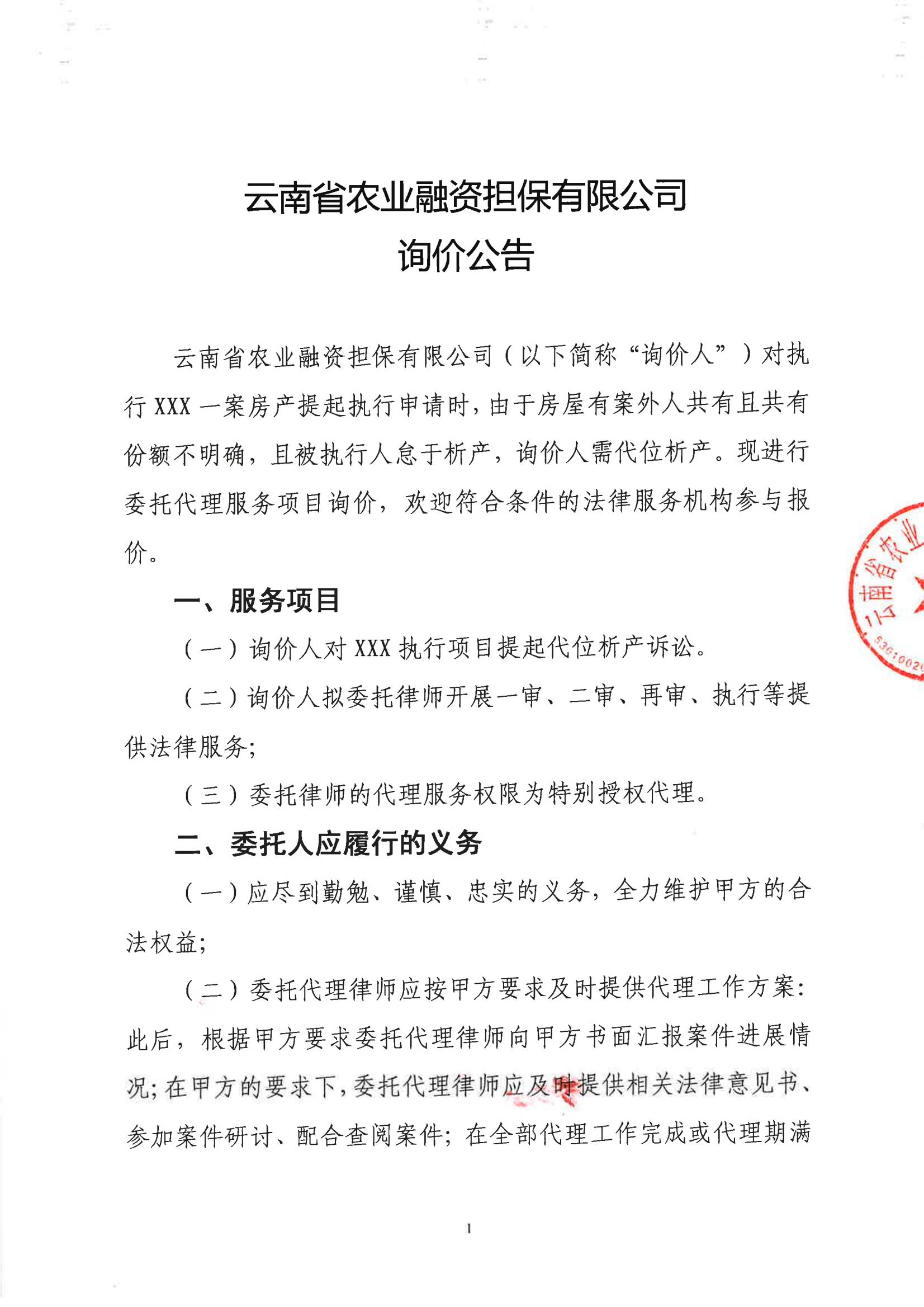 云南省農業(yè)融資擔保有限公司詢價公告