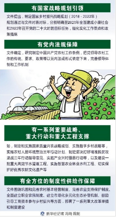 ——有一系列重要戰(zhàn)略、重大行動和重大工程支撐。如,制定和實施國家質(zhì)量興農(nóng)戰(zhàn)略規(guī)劃、實施數(shù)字鄉(xiāng)村戰(zhàn)略等,實施農(nóng)村人居環(huán)境整治三年行動計劃、制定堅決打好精準(zhǔn)脫貧攻堅戰(zhàn)三年行動指導(dǎo)意見、實施產(chǎn)業(yè)興村強(qiáng)縣行動等,以及建設(shè)一批重大高效節(jié)水灌溉工程、實施智慧農(nóng)業(yè)林業(yè)水利工程、切實保護(hù)好優(yōu)秀農(nóng)耕文化遺產(chǎn)等。