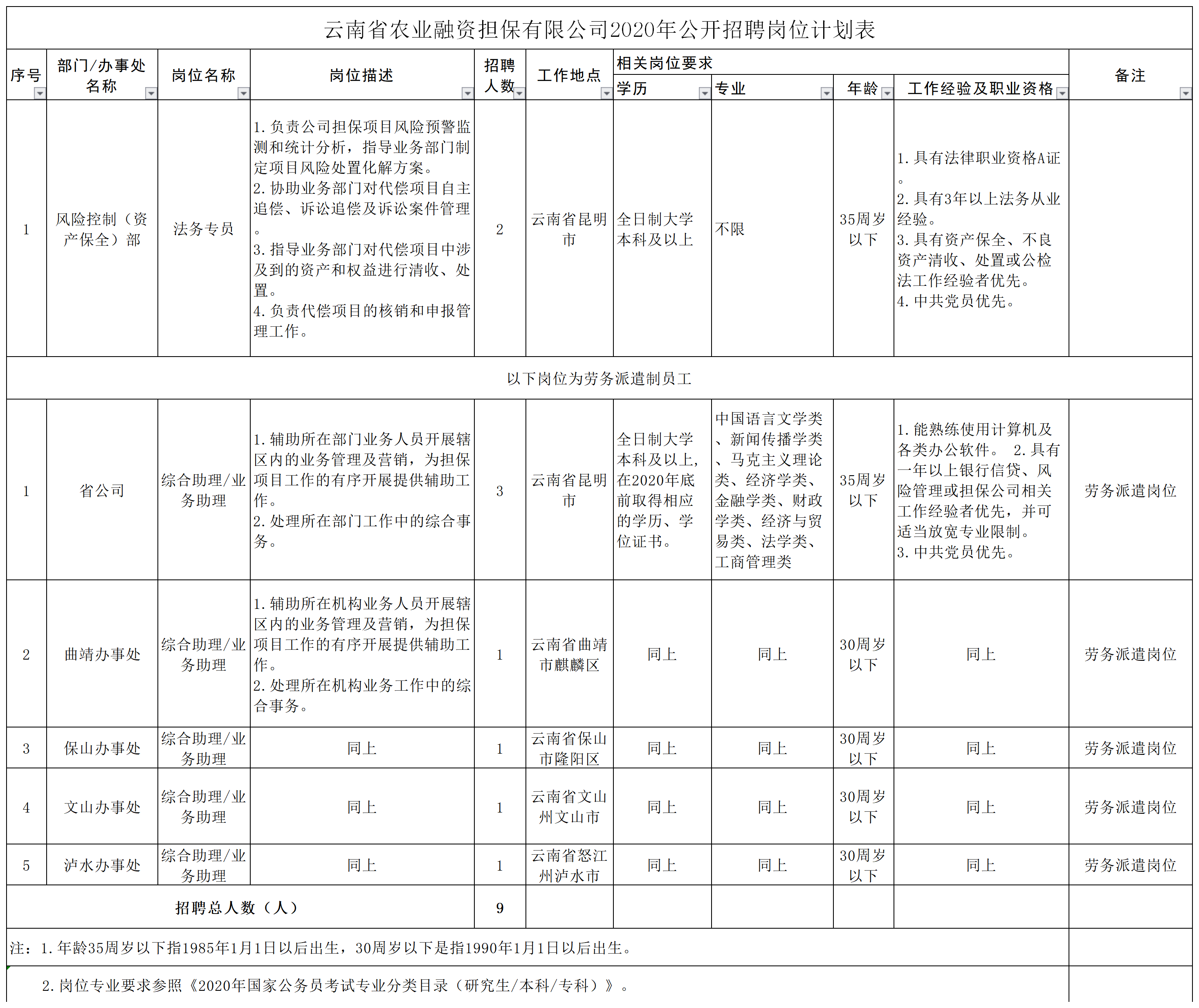 具體崗位及崗位報名條件詳見《云南省農(nóng)業(yè)融資擔(dān)保有限公司2020年公開招聘崗位計劃表》(附件)。