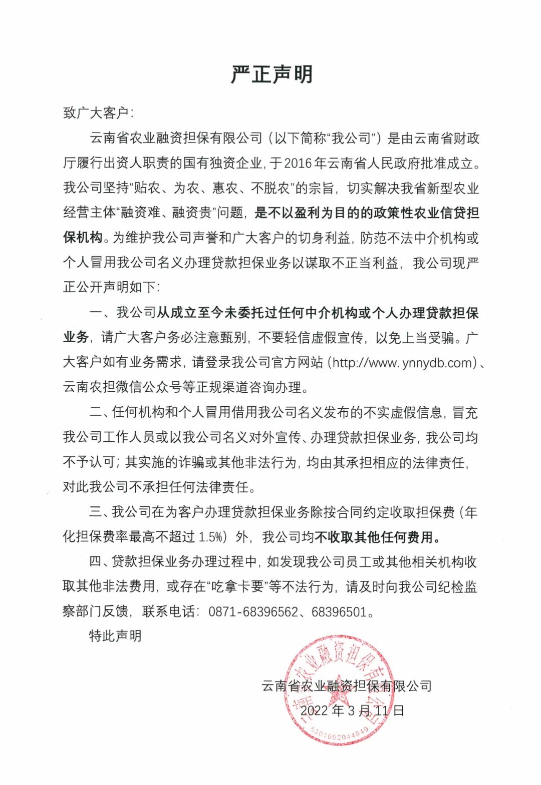 云南省農(nóng)業(yè)融資擔(dān)保有限公司嚴(yán)正聲明