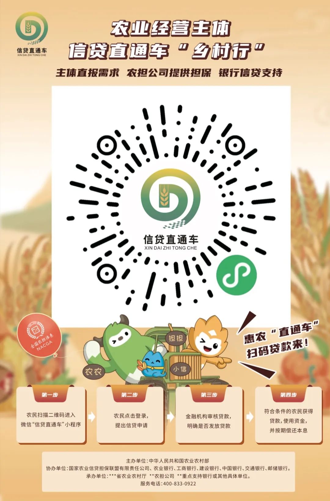 據(jù)悉,“鄉(xiāng)村行”活動(dòng)將通過(guò)集中開(kāi)展信貸直通車專題宣傳推廣,引導(dǎo)大中型銀行機(jī)構(gòu)服務(wù)下沉,將更多的農(nóng)業(yè)農(nóng)村信貸、擔(dān)保、信用、保險(xiǎn)等金融知識(shí)普及到村到戶,只需掃描宣傳掛圖中的二維碼即可提出融資需求,進(jìn)一步提升信貸直通車社會(huì)知曉度和品牌影響力,擴(kuò)大農(nóng)業(yè)經(jīng)營(yíng)主體的覆蓋面和受益面,將更多金融資源引村入戶,助力今冬明春糧食生產(chǎn)和鄉(xiāng)村建設(shè)