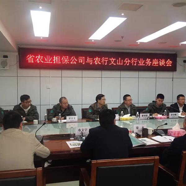 2018年11月26日,省農(nóng)擔(dān)公司領(lǐng)導(dǎo)一行攜硯山辦事處負(fù)責(zé)人與文山硯山長(zhǎng)江村鎮(zhèn)銀行展開座談會(huì)。