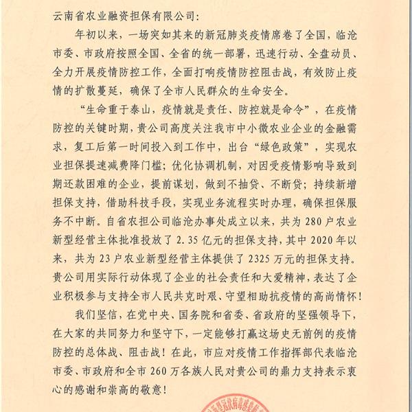 臨滄市應(yīng)對疫情工作領(lǐng)導(dǎo)小組指揮部致函感謝云南農(nóng)擔(dān)